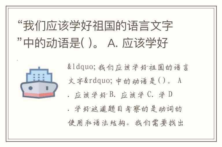“我们应该学好祖国的语言文字”中的动语是( )。 A. 应该学好 B. 应该学 C. 学 D. 学好