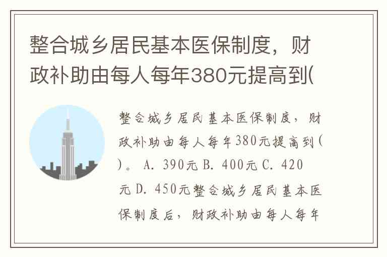 整合城乡居民基本医保制度,财政补助由每人每年380元提高到()。 A. 390元 B. 400元 C. 420元 D. 450元
