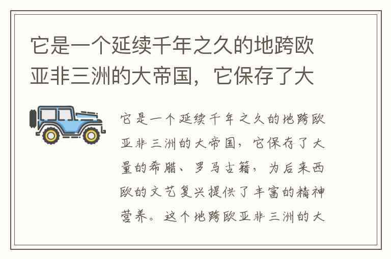 它是一个延续千年之久的地跨欧亚非三洲的大帝国,它保存了大量的希腊、罗马古籍,为后来西欧的文艺复兴提供了丰富的精神营养。这个地跨欧亚非三洲的大帝国是( ) A. 帝国 B. 罗马帝国 C. 奥斯曼帝国 D. 拜占庭帝国