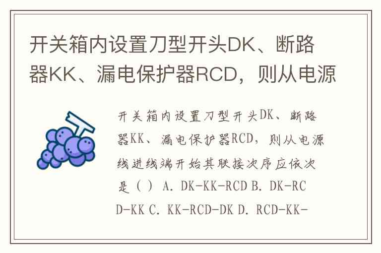 开关箱内设置刀型开头DK、断路器KK、漏电保护器RCD,则从电源线进线端开始其联接次序应依次是() A. DK-KK-RCD B. DK-RCD-KK C. KK-RCD-DK D. RCD-KK-DK