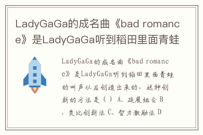 LadyGaGa的成名曲《bad romance》是LadyGaGa听到稻田里面青蛙的叫声以后创造出来的,这种创新的方法是() A. 延展组合 B. 类比创新法 C. 智力激励法 D. 组合创新法