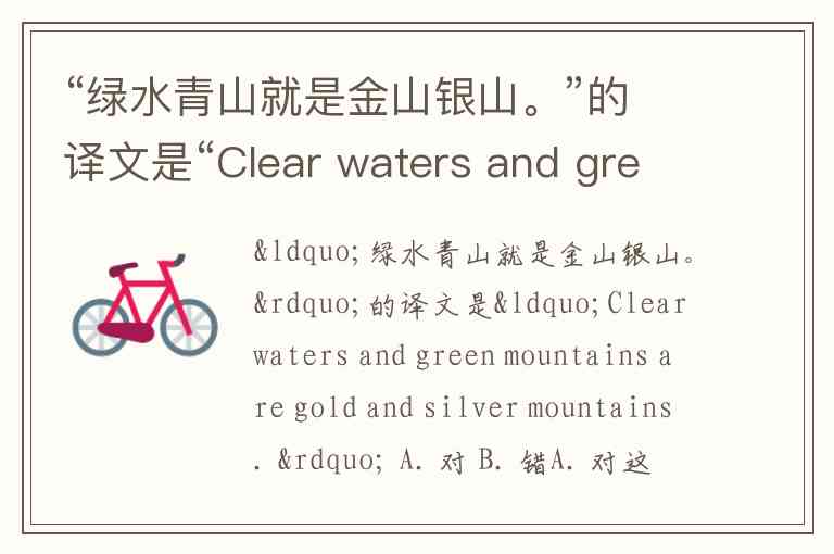 “绿水青山就是金山银山。”的译文是“Clear waters and green mountains are gold and silver mountains. ” A. 对 B. 错