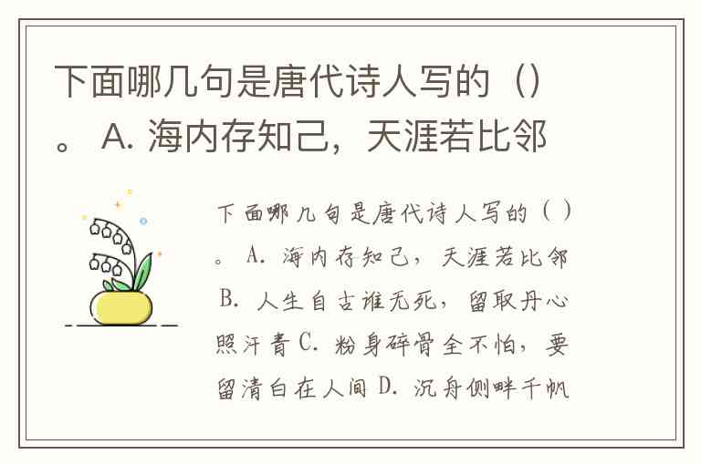 下面哪几句是唐代诗人写的()。 A. 海内存知己,天涯若比邻 B. 人生自古谁无死,留取丹心照汗青 C. 粉身碎骨全不怕,要留清白在人间 D. 沉舟侧畔千帆过,病树前头万木春