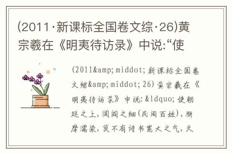 (2011·新课标全国卷文综·26)黄宗羲在《明夷待访录》中说:“使朝廷之上,闾阎之细(民间百姓),渐摩濡染,莫不有诗书宽大之气,天子之所是未必是,天子之所非未必非,天子亦遂不敢自为非是,而公其非是于学校。”与这一论述的精神实质最为接近的是( ) A. 天下兴亡,匹夫有责 B. 民为邦本 C. 天下为公 D. 民贵君轻