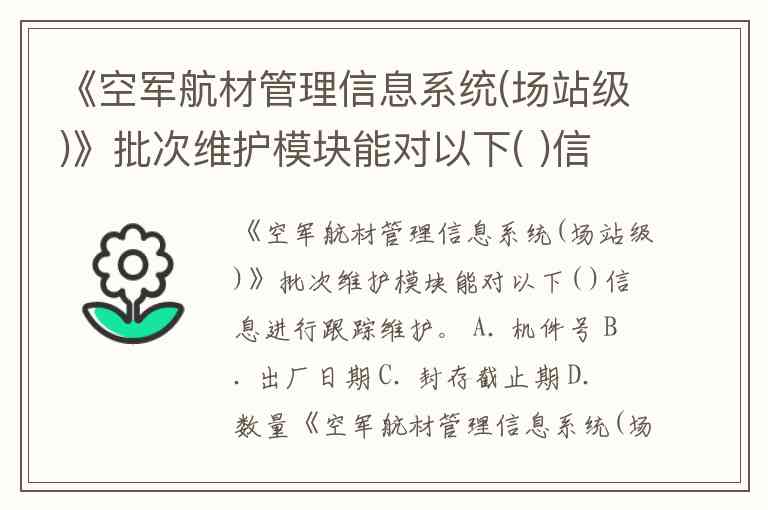 《空军航材管理信息系统(场站级)》的批次维护模块通常用于对航材(航空器维修材料)的管理进行细化和信息化处理。它能够对与航材批次相关的多项信息进行跟踪和维护。根据一般的系统功能,批次维护模块能对以下信息进行跟踪维护: