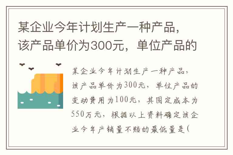 某企业今年计划生产一种产品,该产品单价为300元,单位产品的变动费用为100元,其固定成本为550万元,根据以上资料确定该企业今年产销量不赔的最低量是( )。 A. 2750 B. 13750 C. 27500 D. 55000