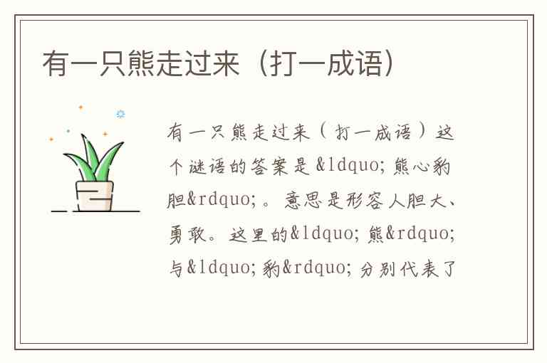 。意思是形容人胆大、勇敢。这里的“熊”与“豹”分别代表了力量和勇猛,恰好符合“熊心豹胆”这一成语的意思。