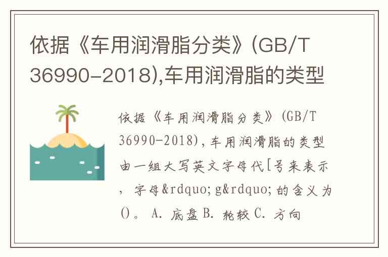 依据《车用润滑脂分类》(GB/T 36990-2018),车用润滑脂的类型由一组大写英文字母代[号来表示,字母”g”的含义为()。 A. 底盘 B. 轮较 C. 方向联轴节 D. 轴承