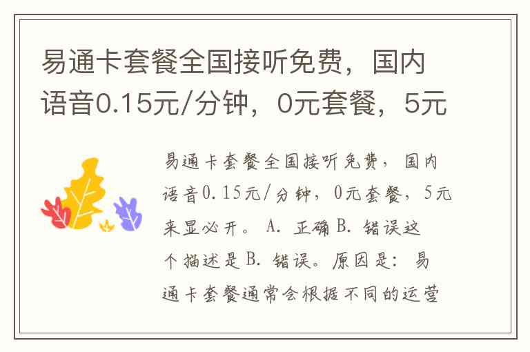 易通卡套餐全国接听免费,国内语音0.15元/分钟,0元套餐,5元来显必开。 A. 正确 B. 错误