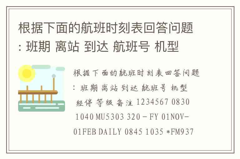 根据下面的航班时刻表回答问题: 班期 离站 到达 航班号 机型 经停 等级 备注 1234567 0830 1040 MU5303 320 - FY 01NOV-01FEB DAILY 0845 1035 *FM9377 767 - FCY X1 1230 1440 CZ3504 330 - FCY 147 1415 1600 MU5305 318 - FY 35 1845 2050 HU7814 737 1 Y X24 2100 2255 CZ3506 300 - FCY X24表示( ) A. 除过24号都有航班 B. 除过2号和4号都有航班 C. 除过周二和周四都有航班 D. 只有周二和周四有航班