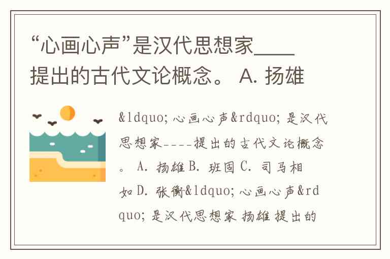“心画心声”是汉代思想家____提出的古代文论概念。 A. 扬雄 B. 班固 C. 司马相如 D. 张衡