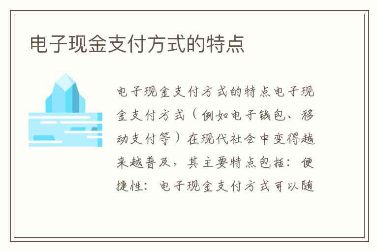 电子现金支付方式(例如电子钱包、移动支付等)在现代社会中变得越来越普及,其主要特点包括: