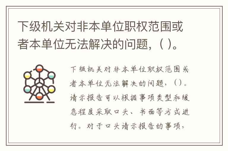 解释:下级机关如果遇到超出本单位职权范围或本单位无法解决的问题,可以向上级机关请示报告。这种请示可以根据事项的类型和缓急程度采取口头或书面方式进行,对于口头请示,双方应当及时做好记录。