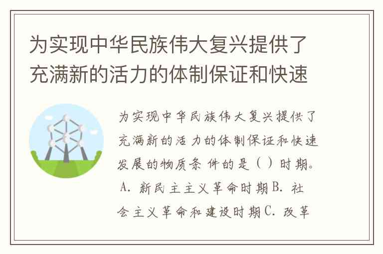 为实现中华民族伟大复兴提供了充满新的活力的体制保证和快速发展的物质条 件的是()时期。 A. 新民主主义革命时期 B. 社会主义革命和建设时期 C. 改革开放和社会主义现代化建设新时期 D. 中国特色社会主义新时代