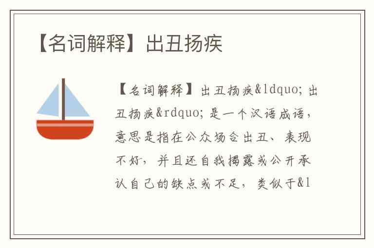 “出丑扬疾”是一个汉语成语,意思是指在公众场合出丑、表现不好,并且还自我揭露或公开承认自己的缺点或不足,类似于“自揭短”,有时带有自嘲的意味。