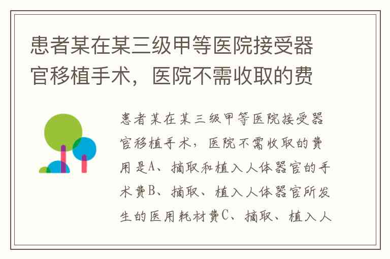 患者某在某三级甲等医院接受器官移植手术,医院不需收取的费用是A、摘取和植入人体器官的手术费B、摘取、植入人体器官所发生的医用耗材费C、摘取、植入人体器官所发生的药费、检验费D、保存和运送人体器官的费用E、支付提供人体器官人员的费用 A. A B. B C. C D. D E. E