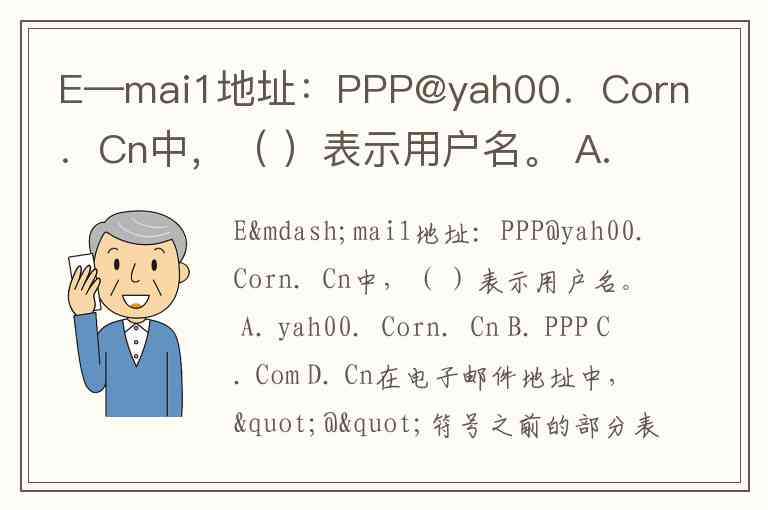 E—mai1地址:PPP@yah00.Corn.Cn中,( )表示用户名。 A. yah00.Corn.Cn B. PPP C. Com D. Cn