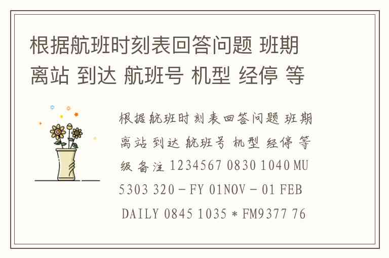 根据航班时刻表回答问题 班期 离站 到达 航班号 机型 经停 等级 备注 1234567 0830 1040 MU5303 320 - FY 01NOV - 01 FEB DAILY 0845 1035 * FM9377 767 - FCY X1 1230 1440 CZ3504 330 - FCY 147 1415 1600 MU5305 318 - FY 35 1845 2050 HU7814 737 1 Y X24 2100 2255 CZ3506 300 - FCY 1、如果此航班时刻表显示的是1 0 月 3 1 日至次年的 2月1 5 日的航班情况,则是( )航班时刻表? A. 春夏季 B. 夏秋季 C. 秋冬季 D. 冬春季