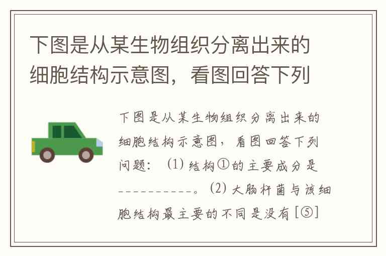 下图是从某生物组织分离出来的细胞结构示意图,看图回答下列问题: (1)结构①的主要成分是__________。(2)大肠杆菌与该细胞结构最主要的不同是没有[⑤]________;若该细胞被某种病毒寄生,则合成该病毒蛋白质的场所是[ ]_____________。(3)能发生碱基互补配对的细胞器有____(填标号),能产生ATP的部位有____(填标号)。(4)若图所示的细胞进入衰老状态,图中结构②会发生的变化是__________________。(5)该细胞可作为下列哪些生物实验的材料?_______(不止一个选项)A.观察细胞的质壁分离及复原 B.观察细胞的有丝分裂C.观察细胞的线粒体 D.叶绿体色素的提取和分离