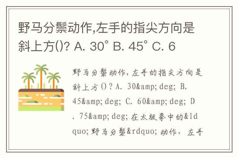 野马分鬃动作,左手的指尖方向是斜上方()? A. 30° B. 45° C. 60° D. 75°