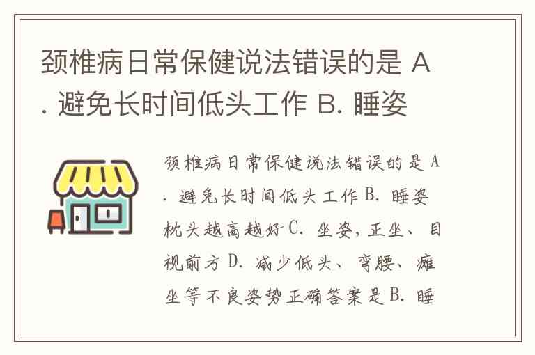 颈椎病日常保健说法错误的是 A. 避免长时间低头工作 B. 睡姿枕头越高越好 C. 坐姿,正坐、目视前方 D. 减少低头、弯腰、瘫坐等不良姿势