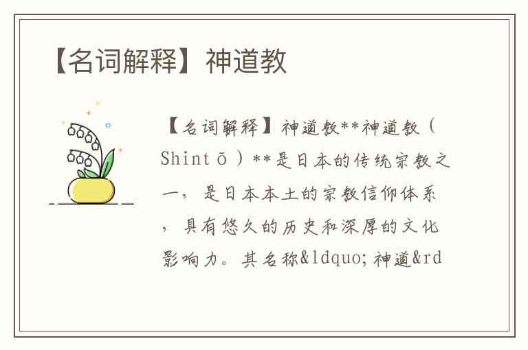 **神道教(Shintō)**是日本的传统宗教之一,是日本本土的宗教信仰体系,具有悠久的历史和深厚的文化影响力。其名称“神道”字面意思为“神的道路”或“神的教义”。它没有固定的创立者,也没有明确的经典文献,而是基于对自然和生命的崇拜、祖先敬仰以及神灵的信仰。