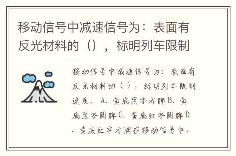 在移动信号中,减速信号是用来提醒列车在某个位置需要减速的。对于表面有反光材料的标志,标明列车限制速度的通常是 黄底黑字方牌。