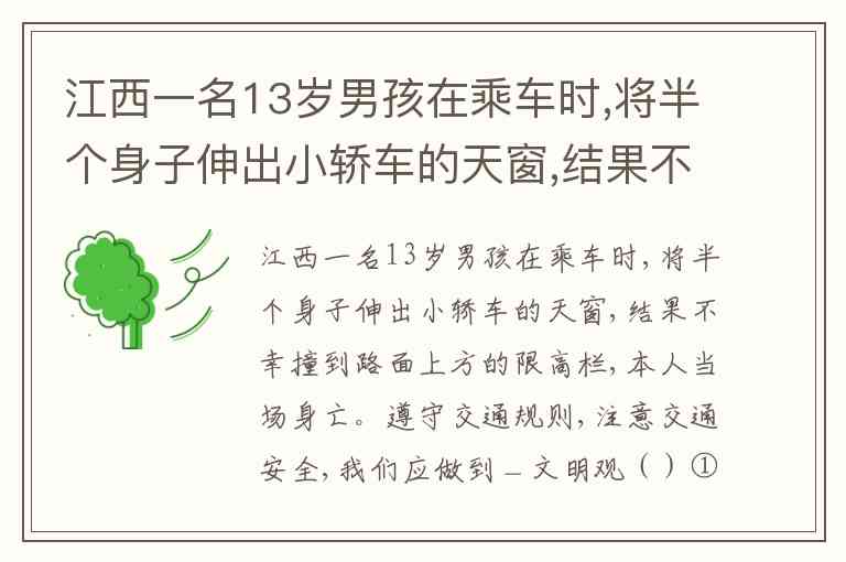 江西一名13岁男孩在乘车时,将半个身子伸出小轿车的天窗,结果不幸撞到路面上方的限高栏,本人当场身亡。遵守交通规则,注意交通安全,我们应做到_文明观()①上车不与他人拥挤②不乘坐超载的车辆③不往车窗外扔东西④过马路走斑马线 A. ①②③④ B. ②③④ C. ①②③ D. ①②④