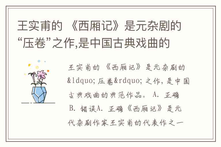 王实甫的 《西厢记》是元杂剧的“压卷”之作,是中国古典戏曲的典范作品。 A. 正确 B. 错误