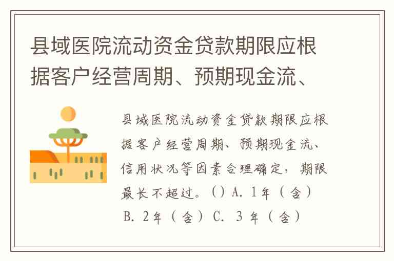 根据我国相关规定,县域医院的流动资金贷款期限应根据客户的经营周期、预期现金流、信用状况等因素合理确定,通常贷款的期限最长为 1年(含)。
