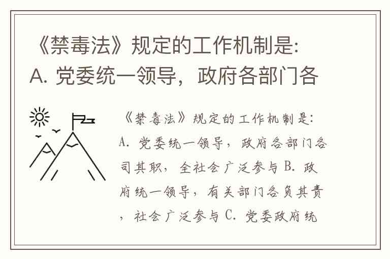 《禁毒法》规定的工作机制是: A. 党委统一领导,政府各部门各司其职,全社会广泛参与 B. 政府统一领导,有关部门各负其责,社会广泛参与 C. 党委政府统一领导,各有关部门各负其责,全社会广泛参与 D. 党委政府领导,各有关部门各负其责,全社会广泛参与