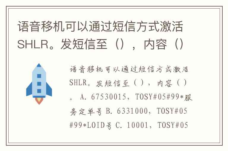 语音移机可以通过短信方式激活SHLR。发短信至(),内容()。 A. 67530015,TOSY#05#99*服务定单号 B. 6331000,TOSY#05#99*LOID号 C. 10001,TOSY#05#99*服务定单号 D. 67505402,TOSY#05#99*LOID号