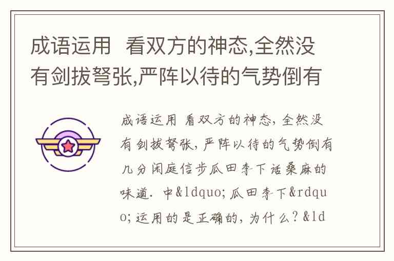 成语运用 看双方的神态,全然没有剑拔弩张,严阵以待的气势倒有几分闲庭信步瓜田李下话桑麻的味道. 中“瓜田李下”运用的是正确的,为什么? “瓜田李下”是从古乐府《君子行》中的诗句“瓜田不纳履,李下不整冠”(直译为:在瓜地里,不要弯腰提鞋;在结着李子的树下,不要举手整理帽子)引申来的.而‘话桑麻’是过故人庄开轩面场圃,把酒话桑麻.中的, 为什么对呢? 为什么对? 对的。