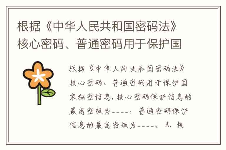 根据《中华人民共和国密码法》核心密码、普通密码用于保护国家秘密信息,核心密码保护信息的最高密级为____,普通密码保护信息的最高密级为____。 A. 机密级 绝密级 B. 机密级 秘密级 C. 绝密级 机密级 D. 绝密级 秘密级