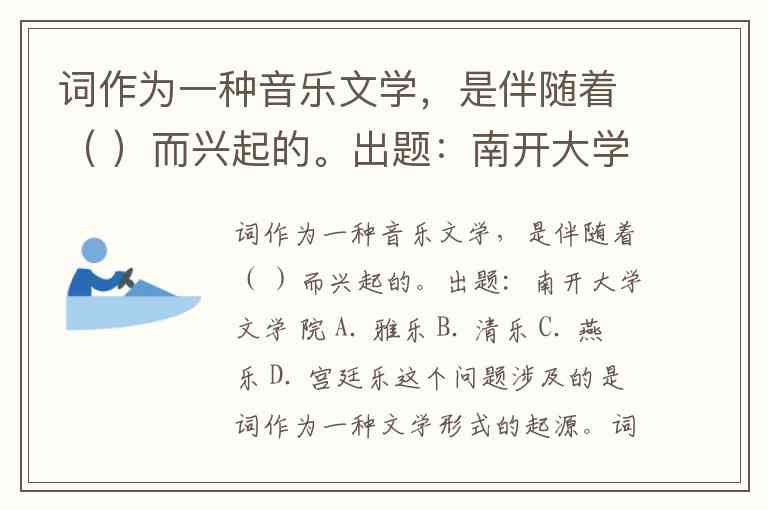 词作为一种音乐文学,是伴随着( )而兴起的。出题:南开大学文学 院 A. 雅乐 B. 清乐 C. 燕乐 D. 宫廷乐