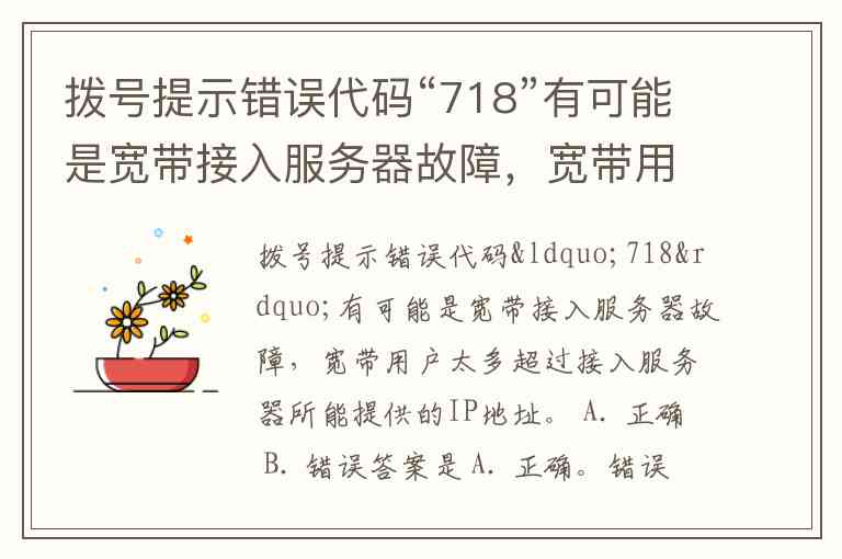 错误代码“718”通常表示连接到宽带接入服务器时出现问题,可能是因为服务器故障,或者宽带接入服务器上的可用IP地址池已被用尽,导致新用户无法分配IP地址从而无法连接。