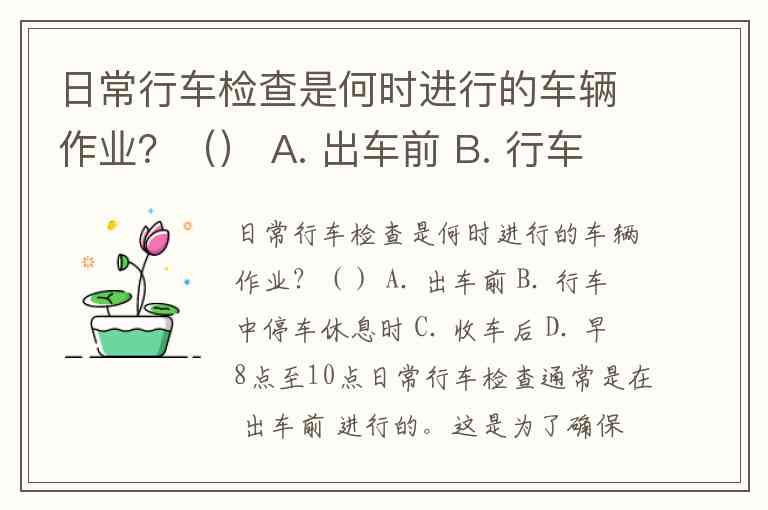 日常行车检查通常是在 出车前 进行的。这是为了确保车辆在行驶过程中安全可靠,检查内容包括油液、轮胎、刹车等是否正常。这样可以避免行车过程中出现安全隐患。