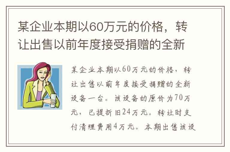 某企业本期以60万元的价格,转让出售以前年度接受捐赠的全新设备一台。该设备的原价为70万元,已提折旧24万元。转让时支付清理费用4万元。本期出售该设备影响当期损益的金额为( )万元。 A. 10 B. 18 C. 80 D. 88