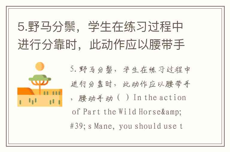 5.野马分鬃,学生在练习过程中进行分靠时,此动作应以腰带手,腰动手动( )In the action of Part the Wild Horse's Mane, you should use the power of your waist to move your arms. A. 正确 B. 错误
