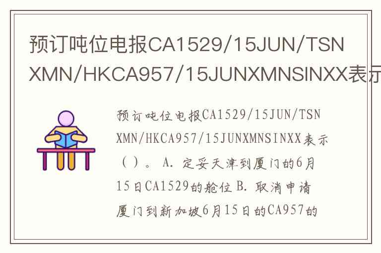 预订吨位电报CA1529/15JUN/TSNXMN/HKCA957/15JUNXMNSINXX表示()。 A. 定妥天津到厦门的6月15日CA1529的舱位 B. 取消申请厦门到新加坡6月15日的CA957的舱位 C. 申请厦门到新加坡6月15日的CA957的舱位 D. 在CA957的舱位已满的情况下,可安排其他航班运输