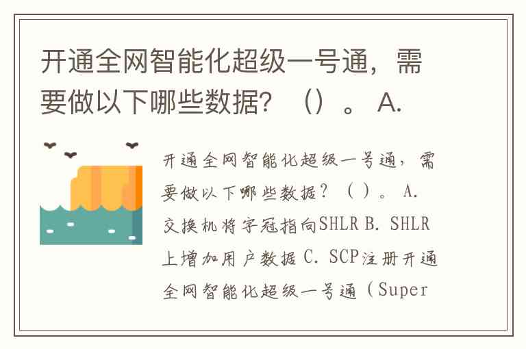 开通全网智能化超级一号通,需要做以下哪些数据?()。 A. 交换机将字冠指向SHLR B. SHLR上增加用户数据 C. SCP注册
