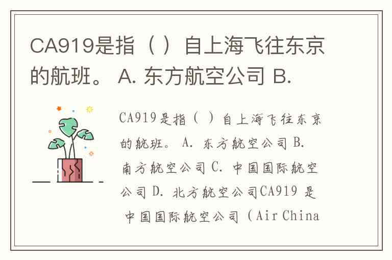 CA919是指( )自上海飞往东京的航班。 A. 东方航空公司 B. 南方航空公司 C. 中国国际航空公司 D. 北方航空公司