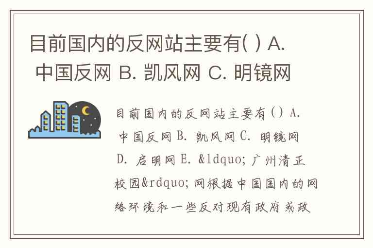 目前国内的反网站主要有( ) A. 中国反网 B. 凯风网 C. 明镜网 D. 启明网 E. “广州清正校园”网