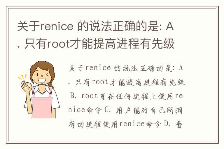 关于renice 的说法正确的是: A. 只有root才能提高进程有先级 B. root可在任何进程上使用renice命令 C. 用户能对自己所拥有的进程使用renice命令 D. 普通用户可提高自己所拥有进程的优先级