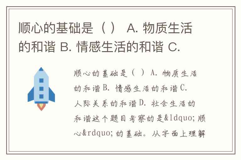 这个题目考察的是“顺心”的基础。从字面上理解,“顺心”是指内心的满足和舒适。因此,答案应当与个人内心的和谐相关。虽然物质、情感、人际和社会生活都与个人的幸福感有关系,但情感生活的和谐往往对内心的平静与满足感有更直接的影响。