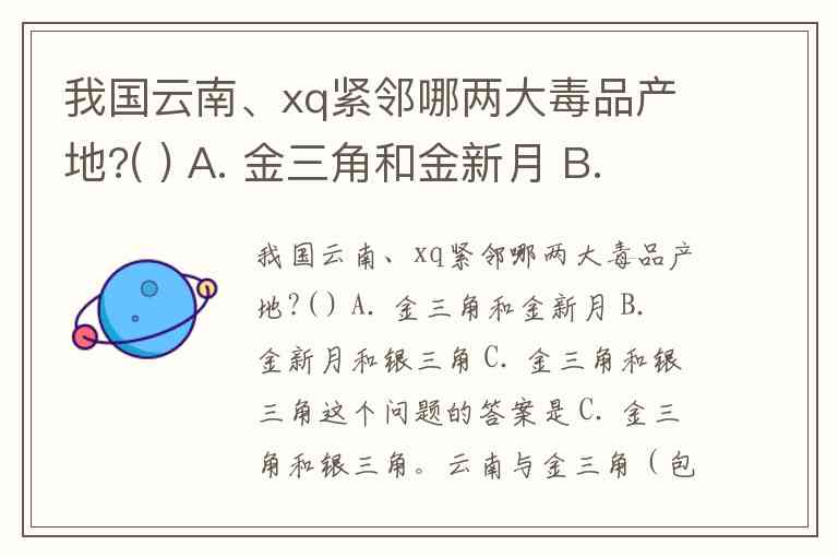 我国云南、xq紧邻哪两大毒品产地?( ) A. 金三角和金新月 B. 金新月和银三角 C. 金三角和银三角