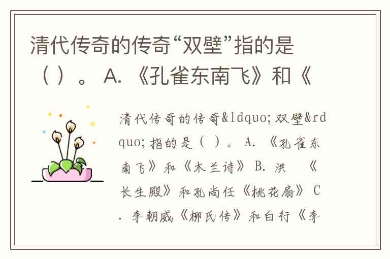 清代传奇的传奇“双壁”指的是( )。 A. 《孔雀东南飞》和《木兰诗》 B. 洪昇《长生殿》和孔尚任《桃花扇》 C. 李朝威《柳氏传》和白行《李娃传》 D. 李渔《凰求凤》和蒲松龄《聊斋志异》