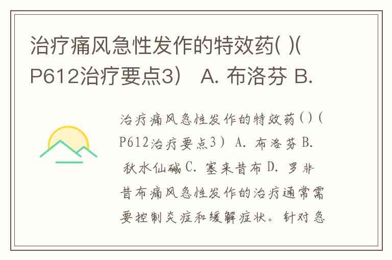 治疗痛风急性发作的特效药( )(P612治疗要点3) A. 布洛芬 B. 秋水仙碱 C. 塞来昔布 D. 罗非昔布