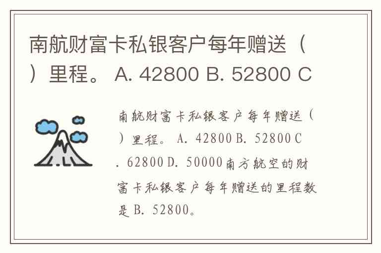 南航财富卡私银客户每年赠送()里程。 A. 42800 B. 52800 C. 62800 D. 50000