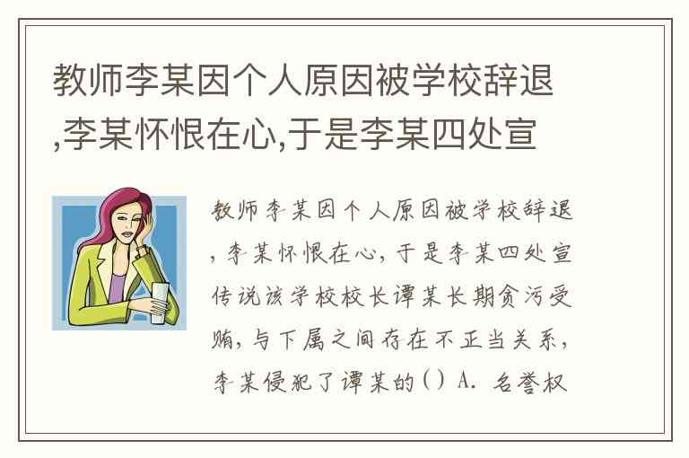 教师李某因个人原因被学校辞退,李某怀恨在心,于是李某四处宣传说该学校校长谭某长期贪污受贿,与下属之间存在不正当关系,李某侵犯了谭某的( ) A. 名誉权 B. 荣誉权 C. 隐私权 D. 人身自由权